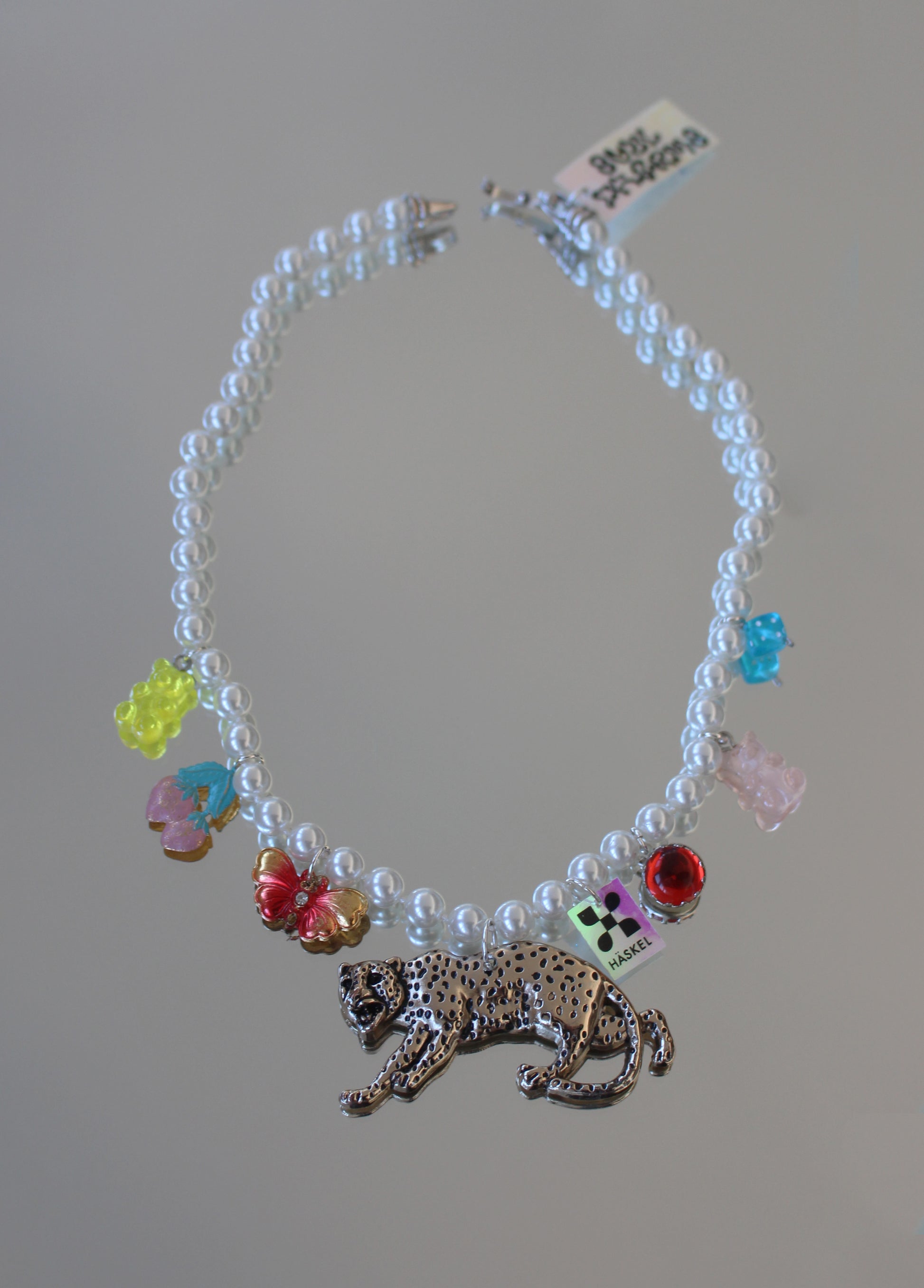 Materials: Necklace of vintage glass pearls, knotted one by one, and diped with curated selected charms. Dolphin with Swarvski eye charm rest in the mittle.