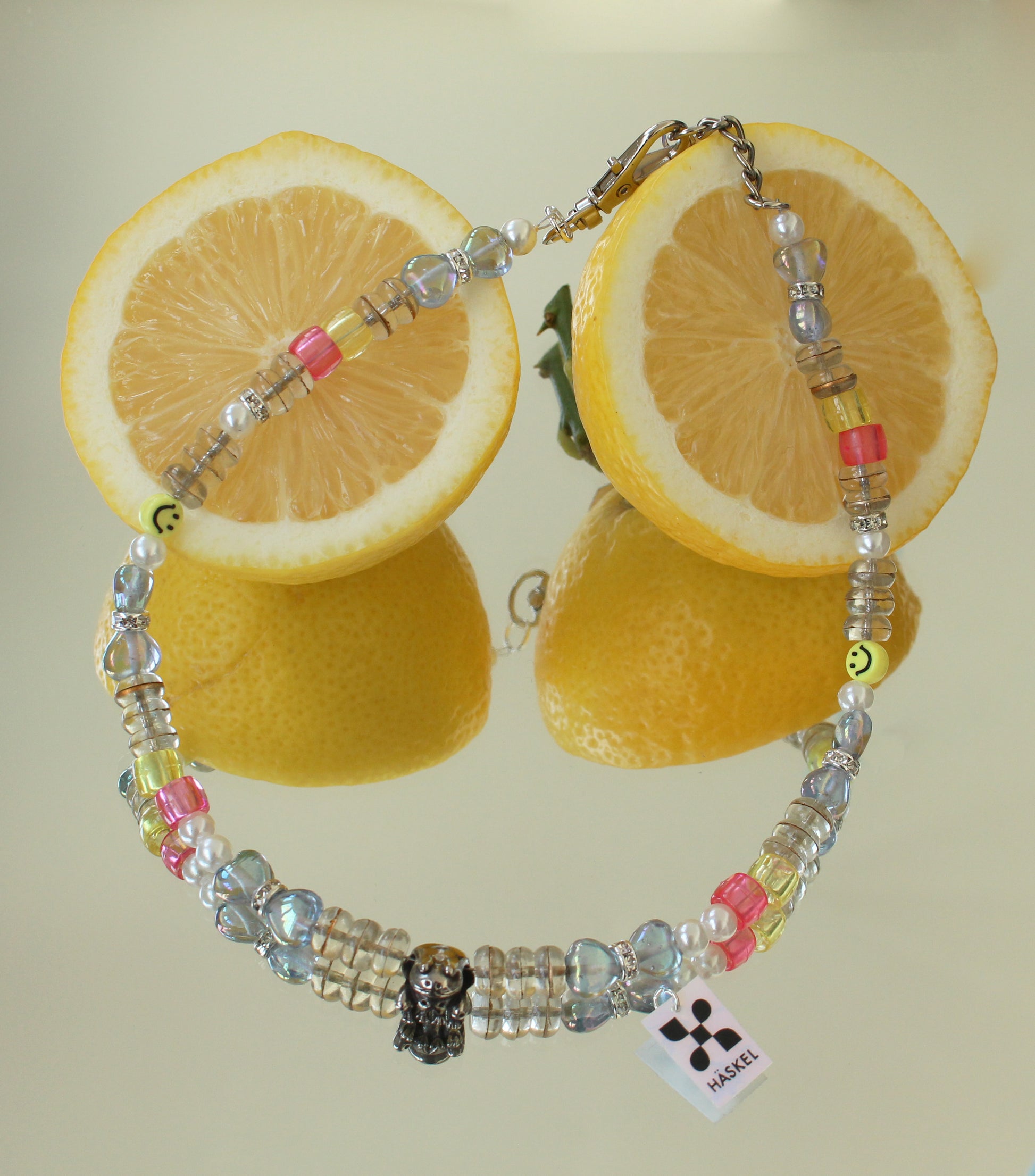 Materials: High-quality vintage glass pearls, galvanised glass hearts, Swarovski in translucid glass and frog charm. Double clasped to be worn at varying lengths as desired from 39 to 43cm.