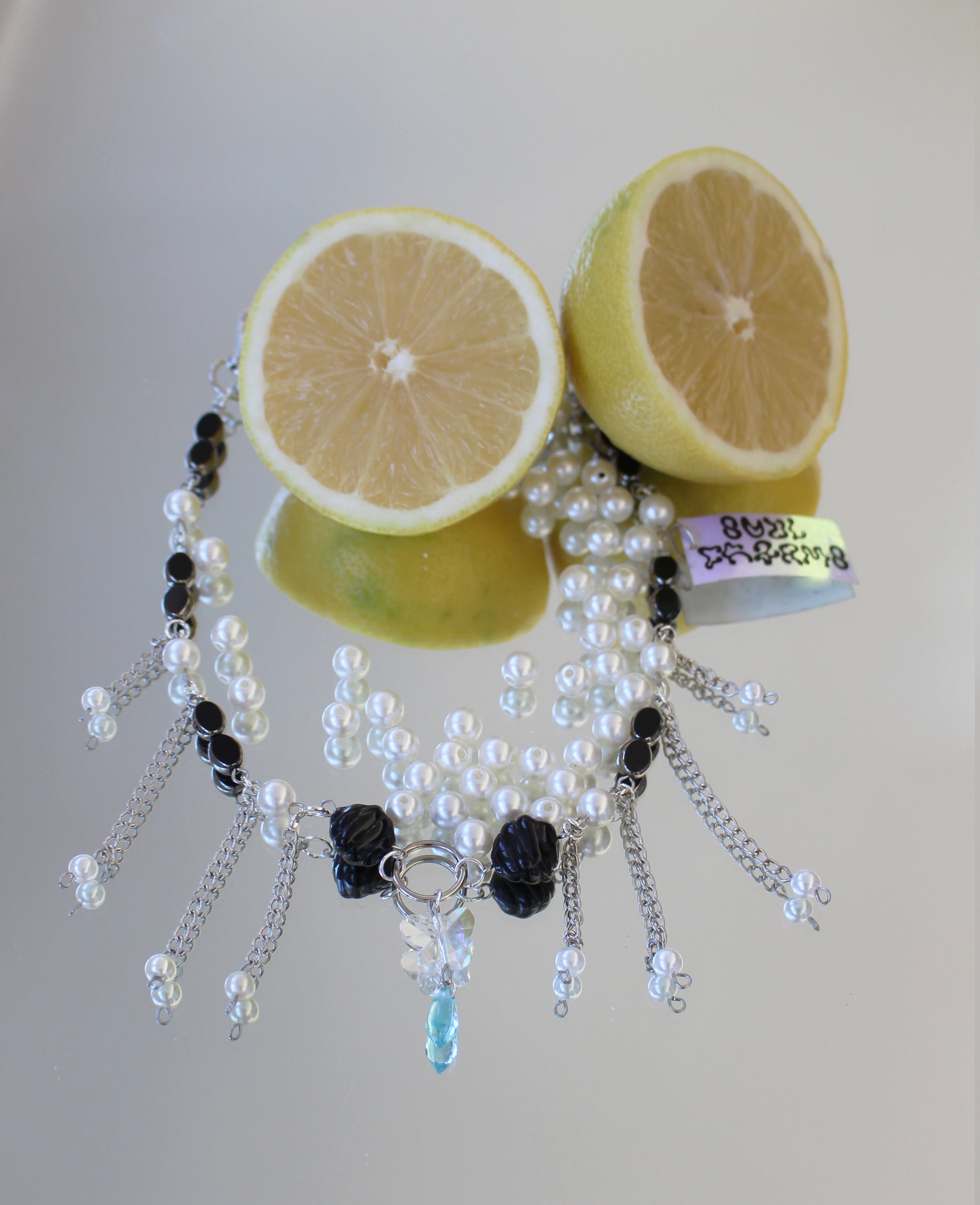 Materials: Handcrafted black Swarovski ensembled chain. Spike, stars and white pearls rest. Double clasped to be worn at varying lengths as desired.