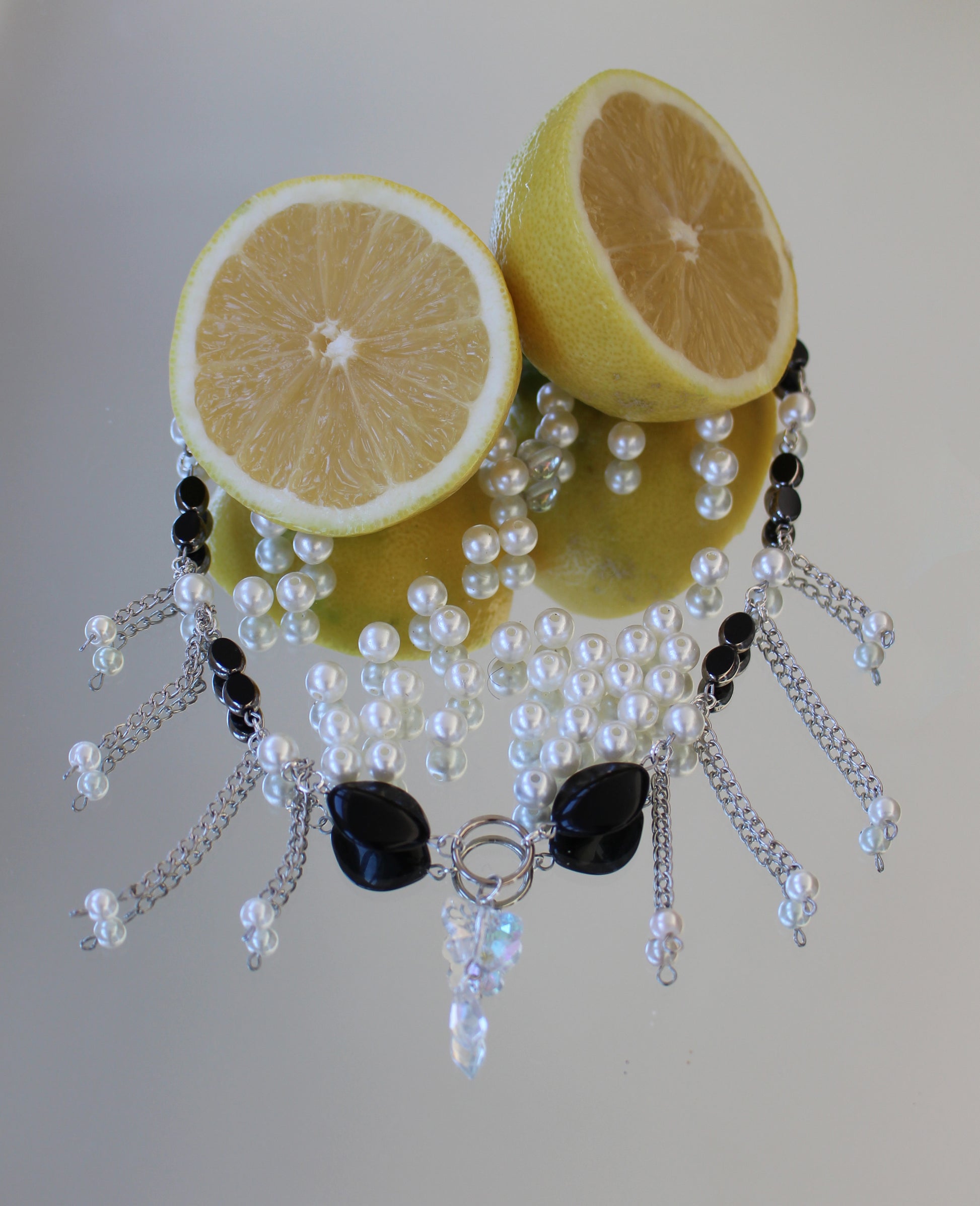 Materials: Handcrafted black Swarovski ensembled chain. Spike, stars and white pearls rest. Double clasped to be worn at varying lengths as desired.