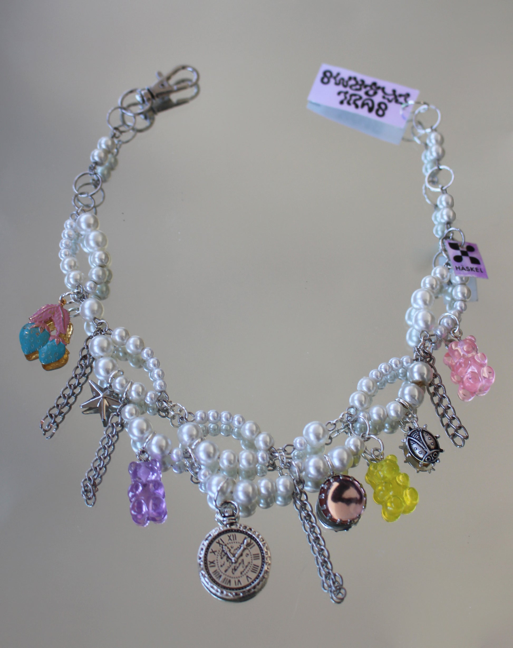 This necklace weaves together fragments from different times. Interlaced pearls and handmade crystal drops meet stars, clock, gummy bears and strass charm — a delicate landscape of light and sparkle.
