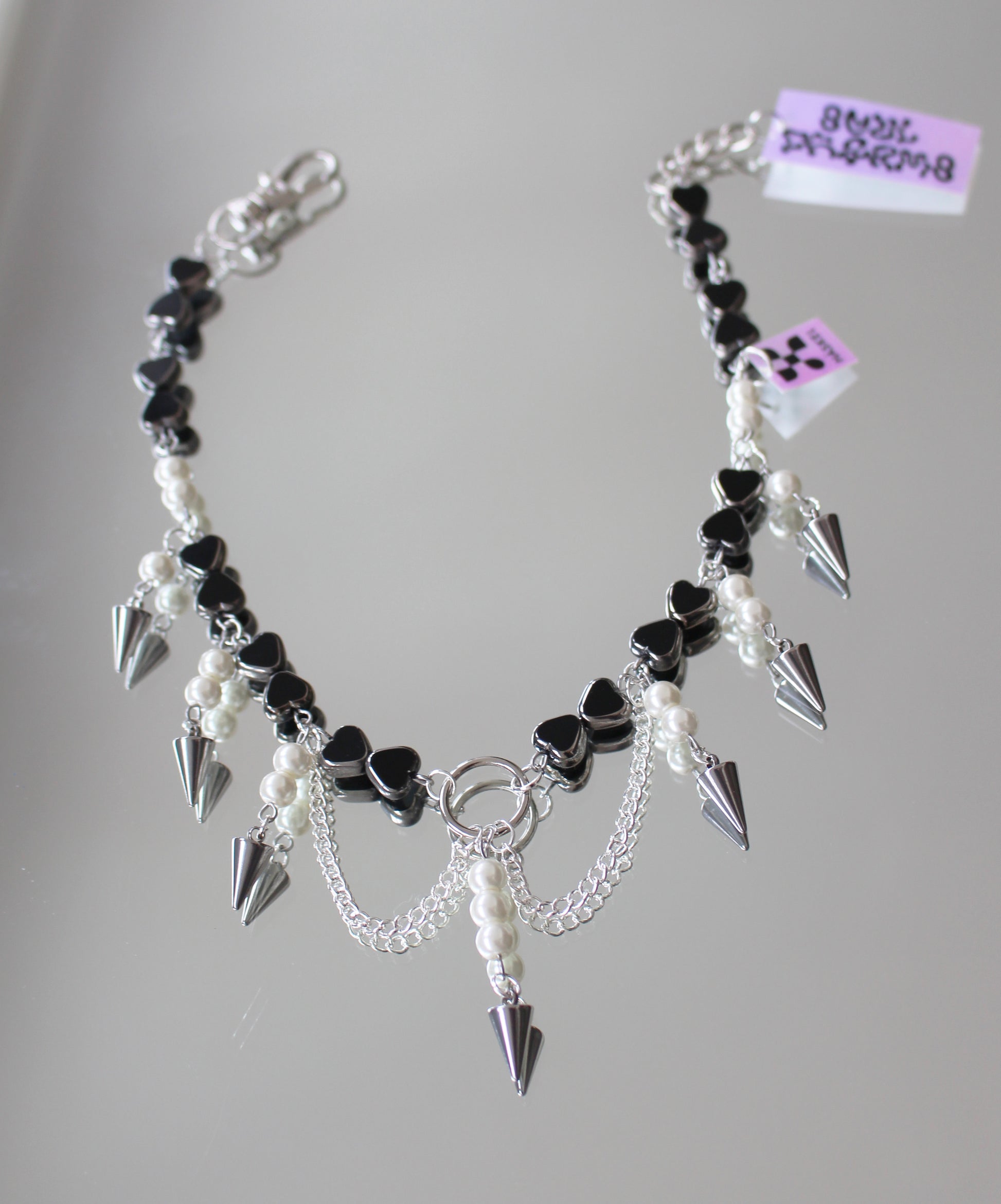 Materials: Handcrafted Swarovski ensembled chain. Spike and white pearls rest. Double clasped to be worn at varying lengths as desired.