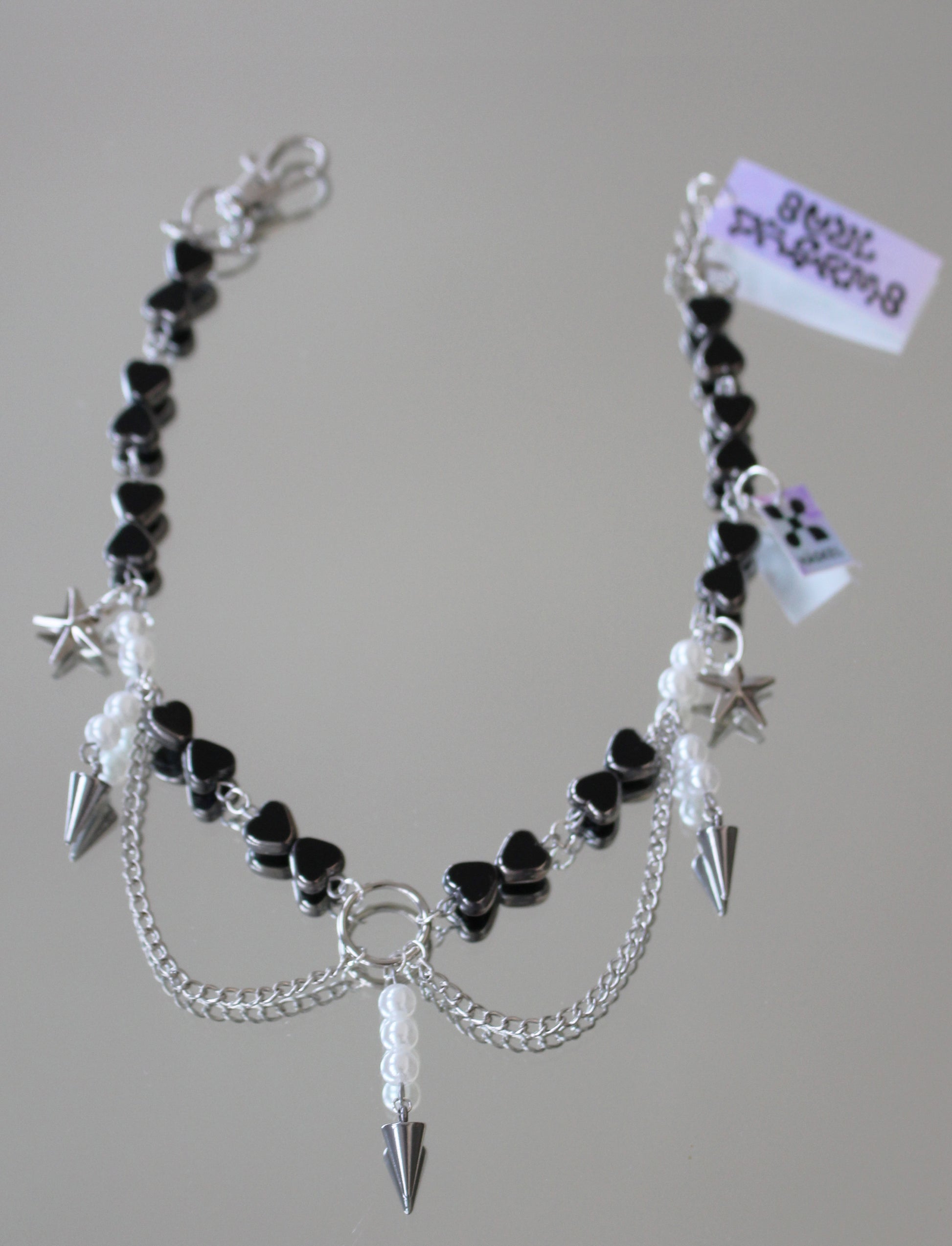 Materials: Handcrafted Swarovski ensembled chain. Spike, stars and white pearls rest. Double clasped to be worn at varying lengths as desired.