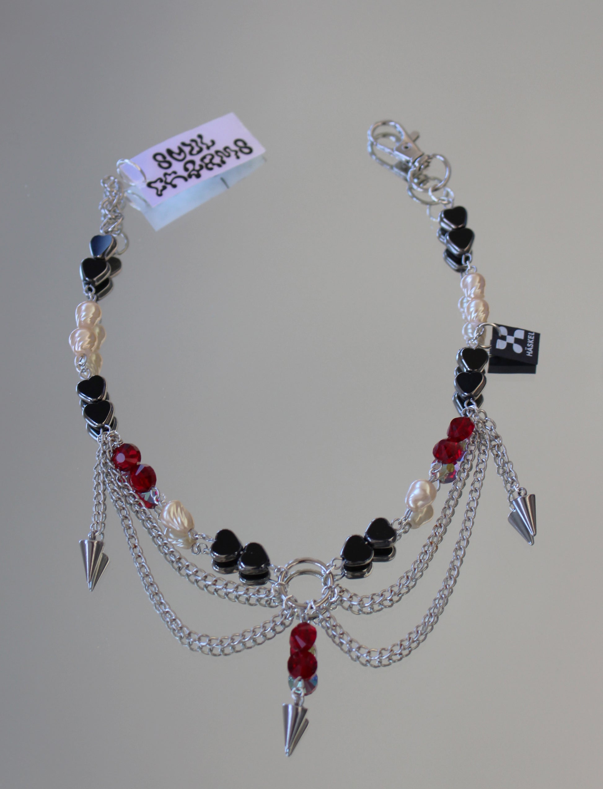 Materials: Handcrafted Swarovski ensembled chain. Spikes, barroc pearls and chain rest. Double clasped to be worn at varying lengths as desired.