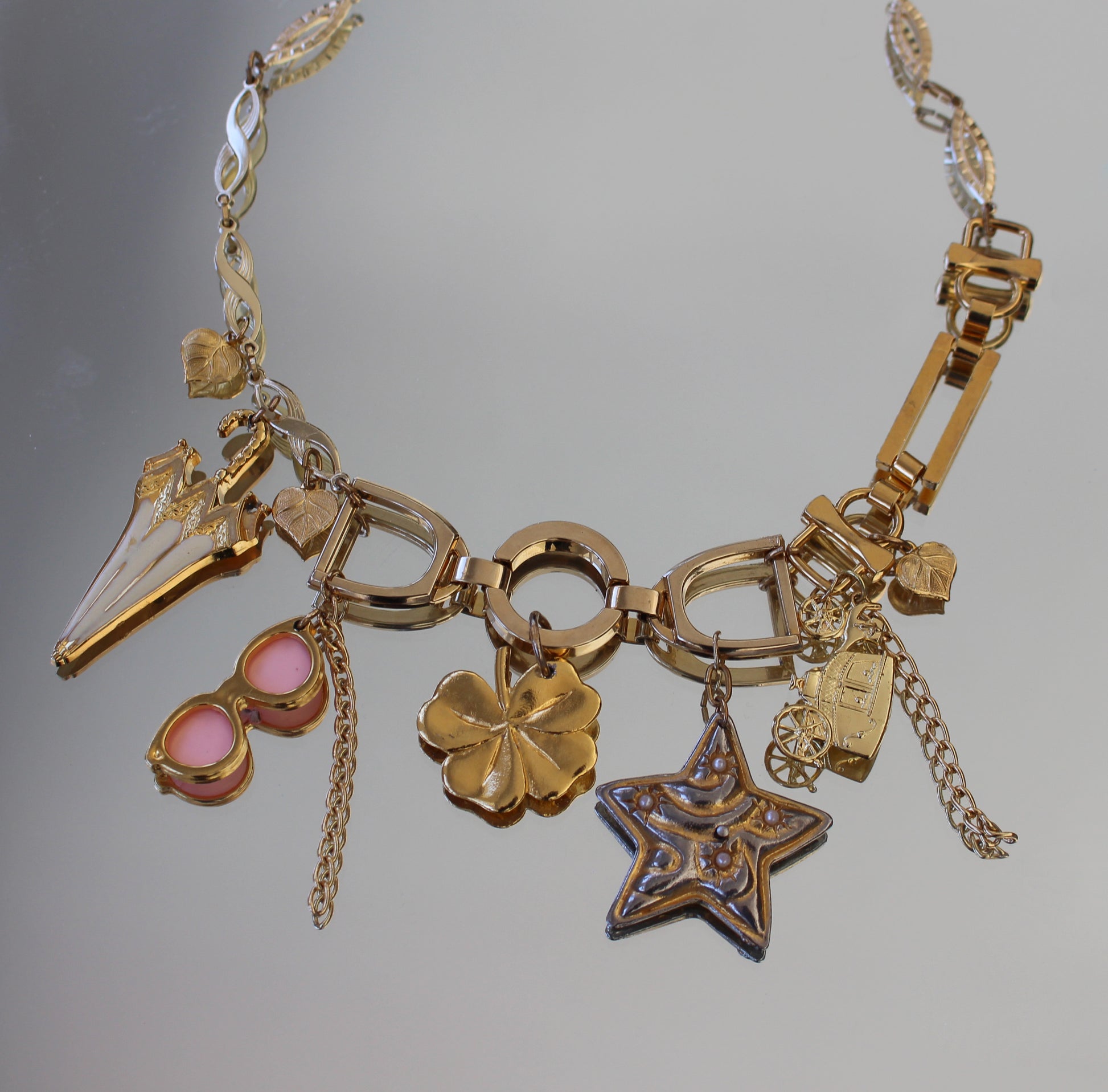 This necklace weaves together fragments from different times: selected lucky charms, antique leafs, forgotten pieces of jewelry, and other objects that carry their own stories.